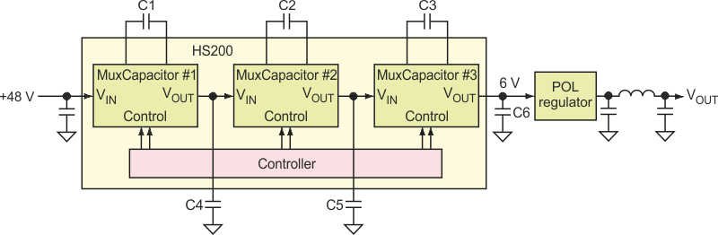 Key to the HS200 is the MuxCapacitor, with its topology that consists of three charge pumps (Fig. 2). Each MuxCapacitor stage can be configured in series to obtain greater voltage division or in parallel for higher current capability. The MuxCapacitor controller optimizes power-delivery efficiency from no-load to maximum power.