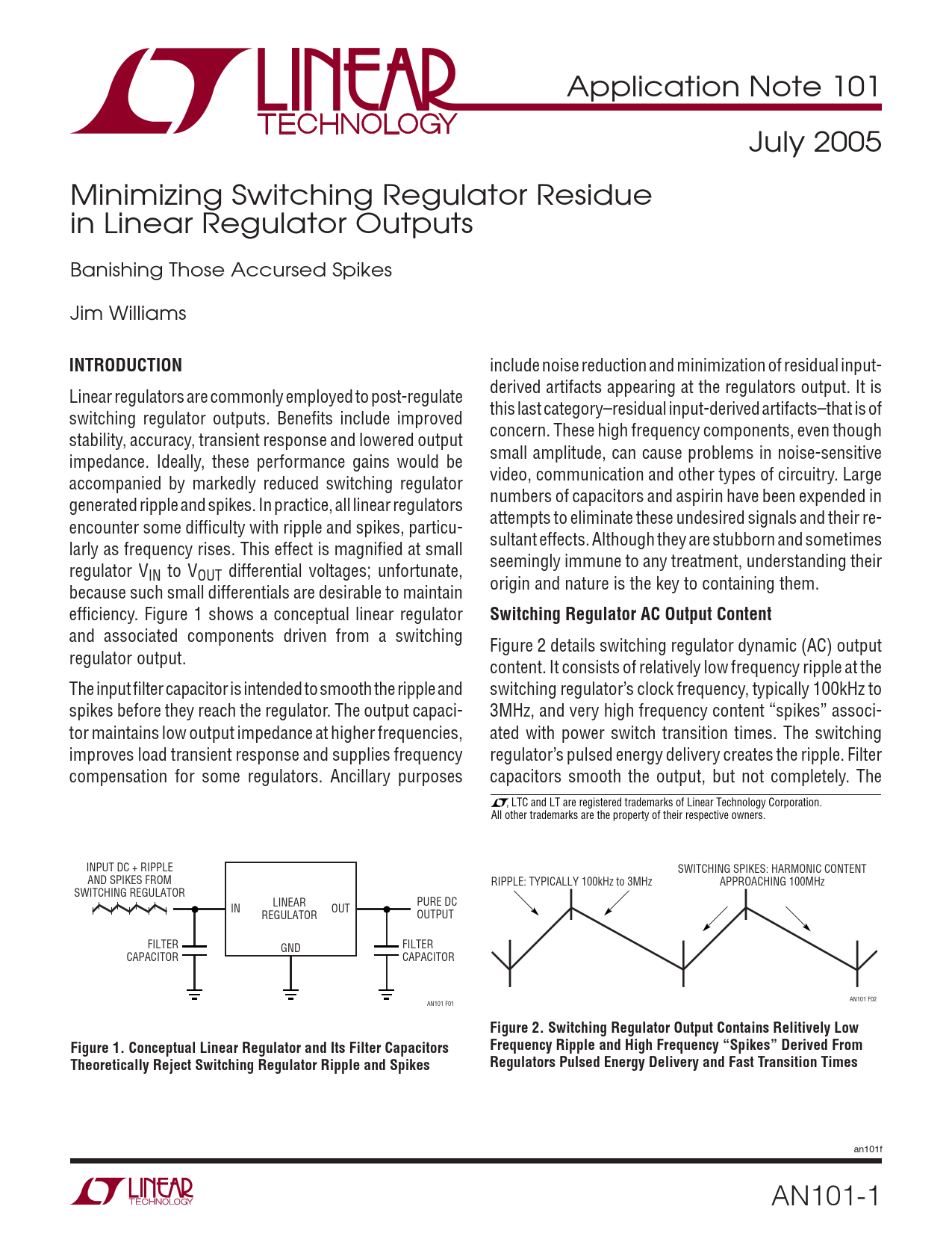 Application Note 101. Linear regulators are commonly employed to post-regulate switching regulator outputs. Benefits include improved stability, accuracy, transient response and lowered output impedance. Ideally, these performance gains would be accompanied by markedly reduced switching regulator generated ripple and spikes. In practice, all linear regulators encounter some difficulty with ripple and spikes, particularly as frequency rises. This publication explains the causes of linear regulators' dynamic limitations and presents board level techniques for improving ripple and spike rejection. A hardware based ripple/spike simulator is presented, enabling rapid breadboard testing under various conditions. Three appendices review ferrite beads, inductor based filters and probing practice for wideband, sub-millivolt signals.