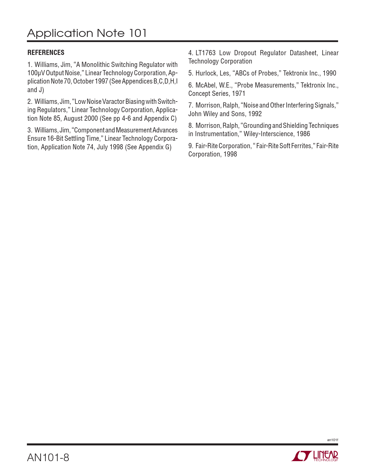 Application Note 101. Linear regulators are commonly employed to post-regulate switching regulator outputs. Benefits include improved stability, accuracy, transient response and lowered output impedance. Ideally, these performance gains would be accompanied by markedly reduced switching regulator generated ripple and spikes. In practice, all linear regulators encounter some difficulty with ripple and spikes, particularly as frequency rises. This publication explains the causes of linear regulators' dynamic limitations and presents board level techniques for improving ripple and spike rejection. A hardware based ripple/spike simulator is presented, enabling rapid breadboard testing under various conditions. Three appendices review ferrite beads, inductor based filters and probing practice for wideband, sub-millivolt signals.