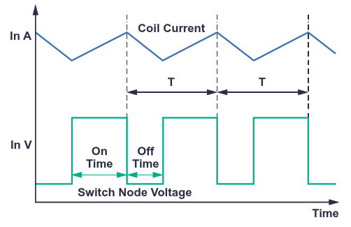Figure 2. Time domain representation of switching in a step-down switching regulator with coil current in CCM
