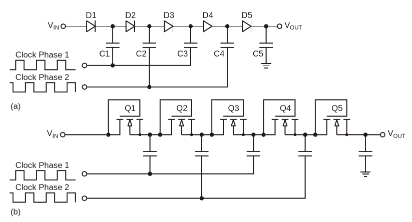 Figure 3. Dickson charge pumps use diodes and MOS-connected diodes