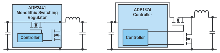 Figure 1. Monolithic buck converter (left); controller solution with external switches (right)