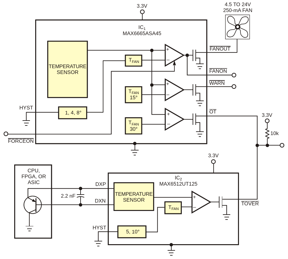 This circuit provides fan control and overtemperature protection for systems and high-power digital ICs