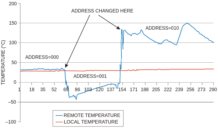 Figure 2. The system in Figure 1 measures ambient (address 000), cold (address 001), and hot (address 010) temperatures