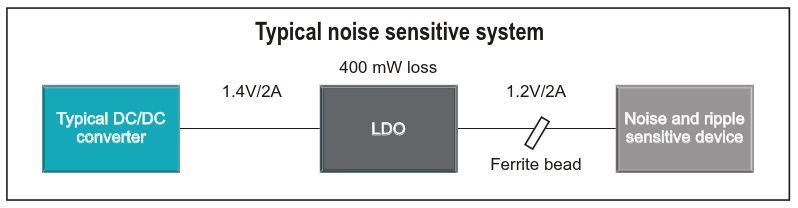 A typical low-noise architecture using a DC/DC converter, LDO and ferrite-bead filter