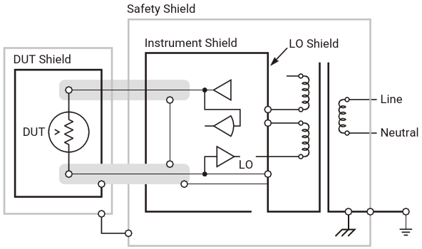 The proper use of the shield in a test system. The electrostatic shield is grounded to circuit common. Notice that both the HI and the LO terminals are shielded