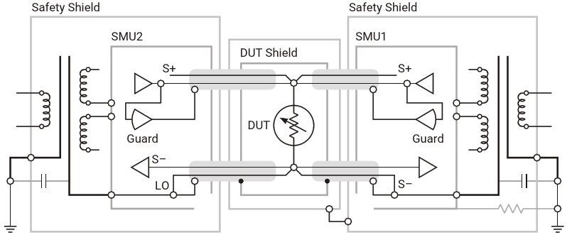 Figure 5c. With a single SMU, grounding the shield with a resistor, at the instrument leads to no error current in the measurement LO lead