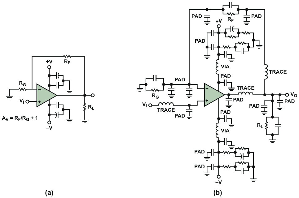 Typical op amp circuit, as designed (a) and with parasitics (b)