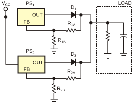 Figure 1. A standard redundant configuration of power supply modules uses ORing diodes at the outputs