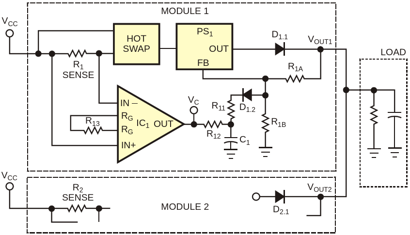 Figure 1. A standard redundant configuration of power supply modules uses ORing diodes at the outputs