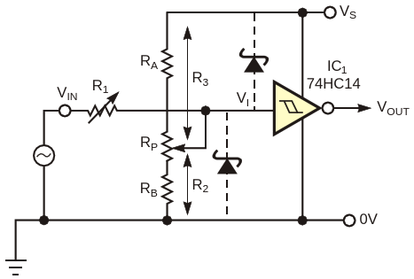 Figure 1. This Schmitt-trigger circuit is useful for converting an ac signal to digital form