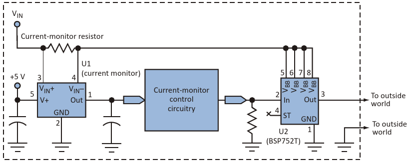 To protect the current-monitor resistor from a field-wiring error that could cause a short circuit, this circuit feeds the current from the resistor to a self-protected high-side driver's V
