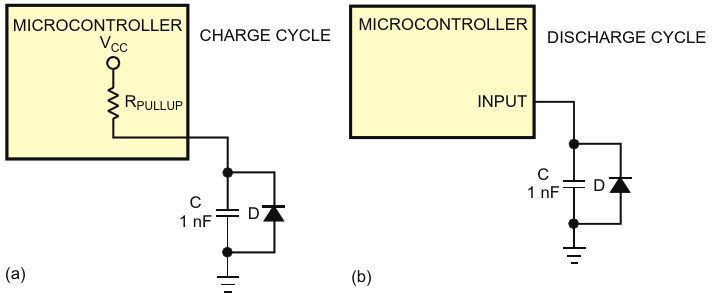 Capacitor C first charges through the pull-up resistance of the microcontroller's I/O pin configured as an output (a). The capacitor then discharges through the reverse leakage of diode D (b)