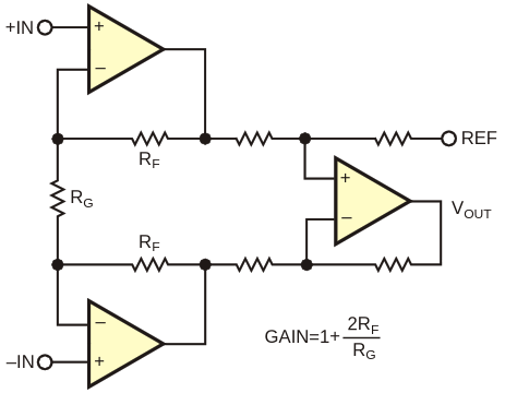 Figure 1. The classic three-op-amp instrumentation amplifier does not provide differential outputs