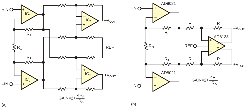 The four-op-amp instrumentation amplifier (a) provides differential outputs but requires many matched resistors. A differential-output op amp (b) reduces the IC count in Figure 2a to three
