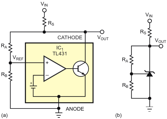 Despite the block diagram, the TL431 is internally complex (a), but you need only three external resistors to use the TL431 in a basic shunt-regulator circuit (b)