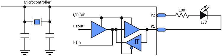 Figure 1. A standard LED, connected to a pair of microcontroller bidirectional I/O pins with a high-impedance capability, can act as a photodiode to detect light intensity