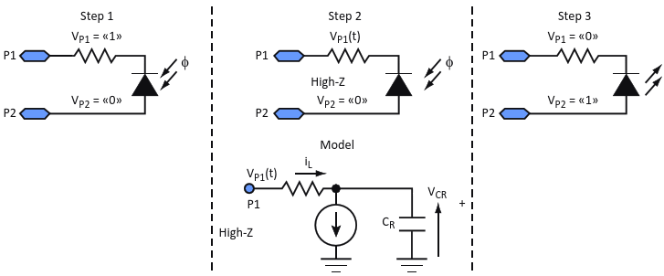 Figure 2. The LED photodiode circuit operates in three steps, with control provided through the microcontroller and a C-based software routine