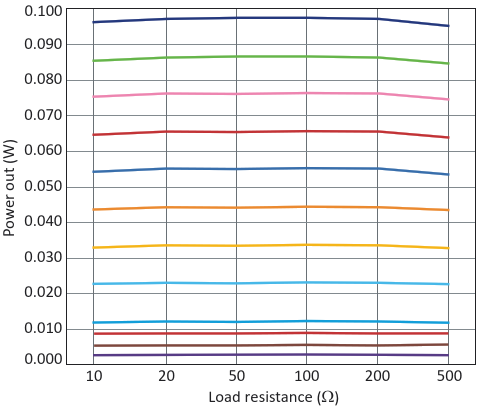 The power output for the circuit in Figure 2 remains well regulated for a wide range of loads and for various values of VPOWER_SET, which range from 0.0021 (bottom) to 0.0300 V (top).