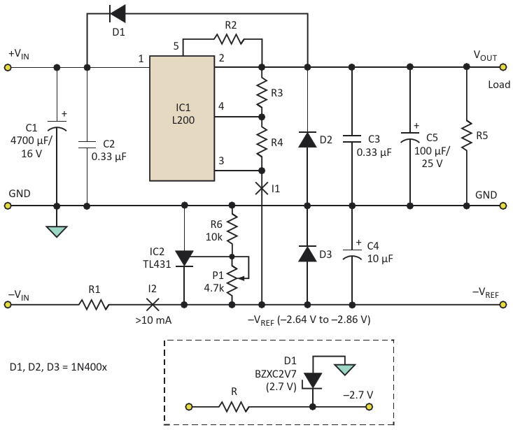 For adjustable regulators such as the L200, a shunt regulator acts as an active voltage reducer while a potentiometer allows careful adjustment to the desired voltage value
