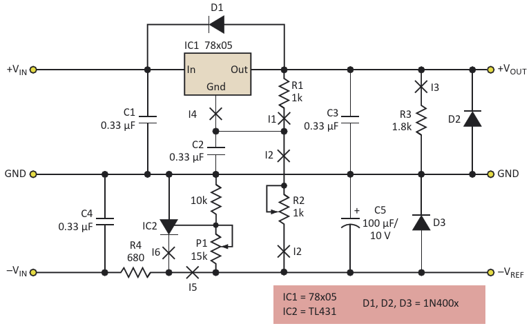 Figure 4. A similar approach works with the 78xx family, but requires a change in the details of the circuit topology