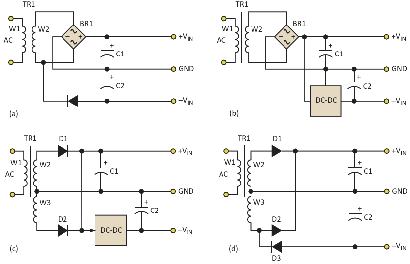 Figure 5. If a negative voltage is needed, there are various common techniques to generate negative dc rails from an ac supply, including a full-wave bridge plus additional diode (a), a full-wave bridge plus negative dc-dc converter and regulato (b), a half-bridge