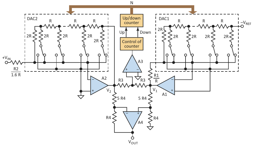 Figure 2. The example circuit uses only four switches within each DAC for clarity, but the number of switches can be increased for improved accuracy