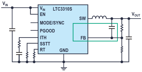 Figure 1. An example of a switching regulator that uses a control loop (shown in green) to regulate its output voltage