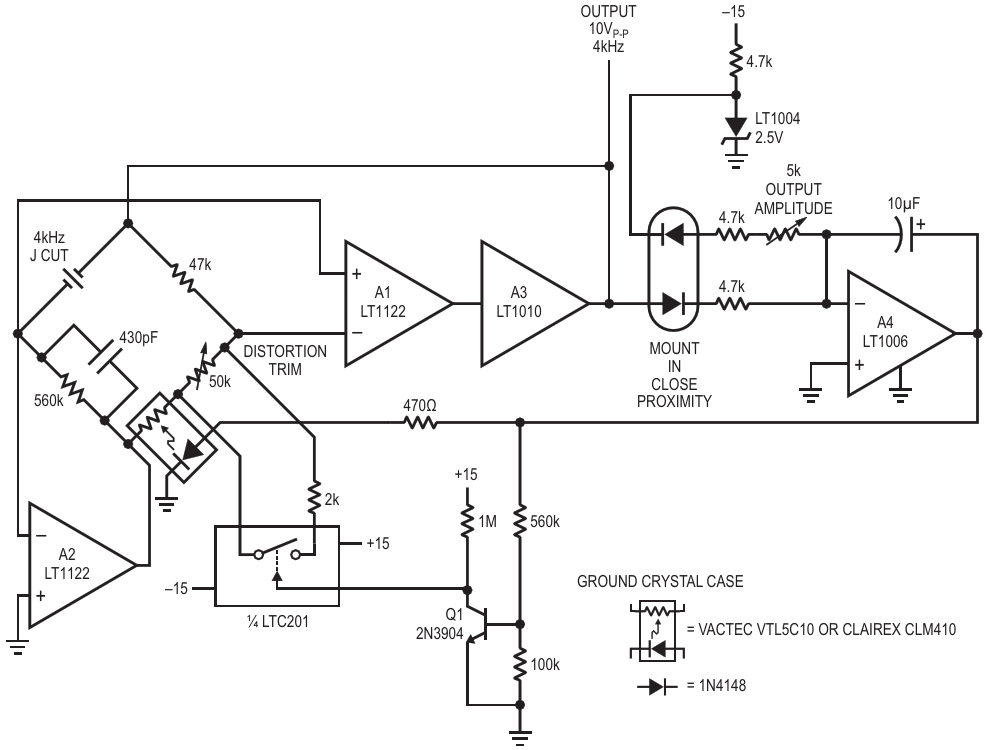Quartz stabilized 4 kHz oscillator with 9 ppm distortion