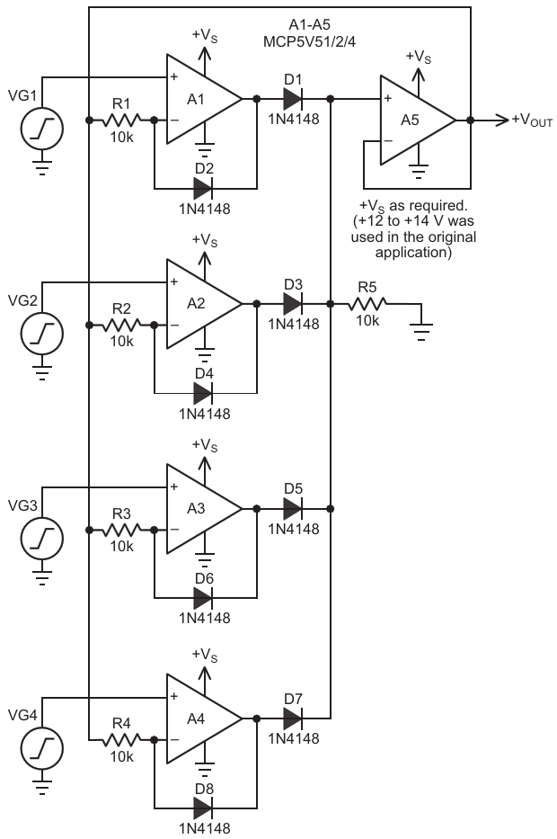 Figure 1. Input Priority Amplifier provides an output from the most positive of four inputs. This circuit responds to positive inputs, but by reversing the diodes and re-configuring the power supplies, it can respond to negative inputs