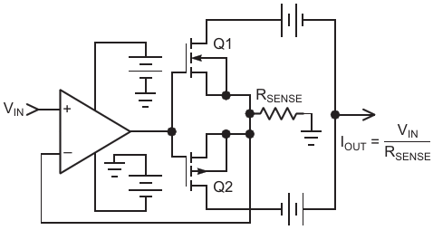Figure 2. This simple current source (Simple Source) circuit provides accuracy with a single resistor by floating the power supplies of the output stage. Isolated dual output DC to DC converters are readily available at many power levels as a check of your favorite