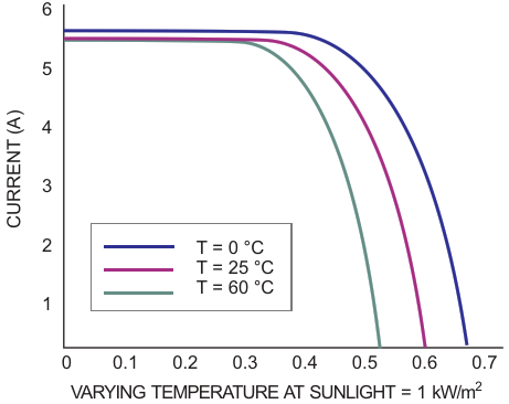 Figure 2. A solar cell's output voltage decreases with an increase in temperature
