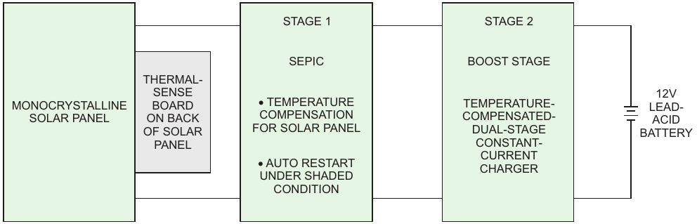 The solar charger system uses an 18-cell, 3 W solar panel as the input source. The system comprises two stages, in which the first stage monitors the solar panel's voltages using a SEPIC topology and provides the output voltage, which tracks the input of