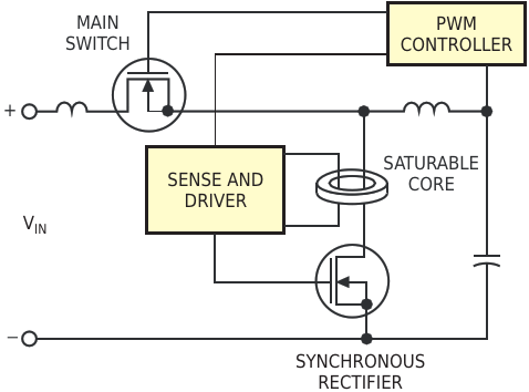 A low-cost, saturable core in the drain circuit of the synchronous rectifier introduces a "self-timing" feature in the circuit