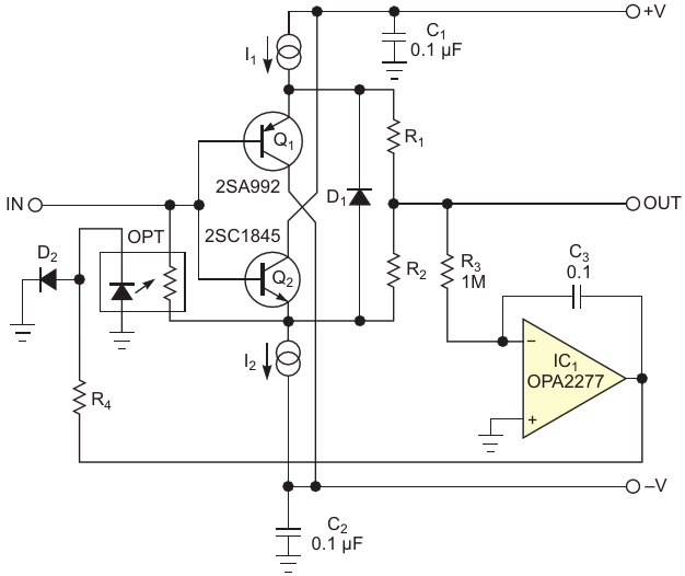 Figure 1. The buffer provides unity gain, low output impedance, and low distortion; see Figure 2 for details of the current sources in the transistors' emitters