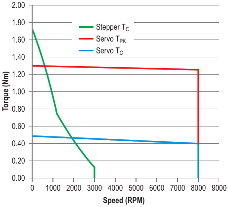 These torque versus speed curves show that stepper motors deliver peak torque at zero speed with torque falling off as speed increases (green). Servo-motor torque, however, remains roughly constant across the operating range (blue and red)