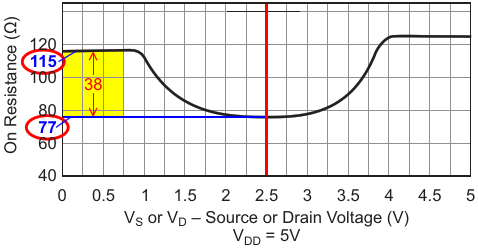 On-resistance versus source or drain voltage for the TMUX4053 with an unequal at