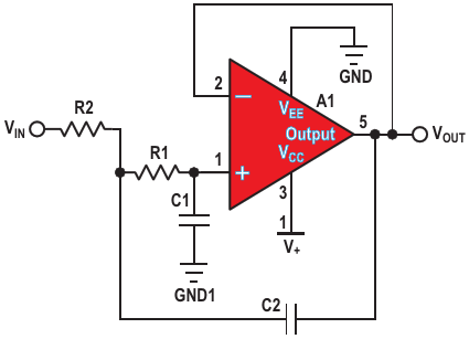 Figure 3. A Sallen-Key second-order, dual-supply, low-pass unity gain filter. The gain of this circuit is equal to 1 V/V