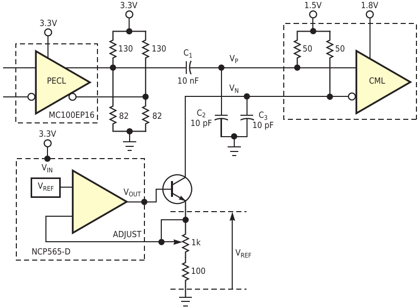 Figure 2. By exploiting the rise and fall time of a signal and manipulating a dc bias voltage, you can control the duty cycle of a CML signal