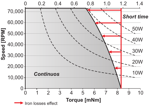 This graph shows the effect of iron losses on the power curve of a BLDC motor, the Portescap 16ECS36
