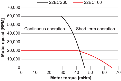This graph shows the power curves, including losses, of two Portescap motors with different number of poles operating continuously in air at 25 °C. The four-pole motor, a torque-optimized 22ECT60 (red), quickly loses torque capabilities as speed incre