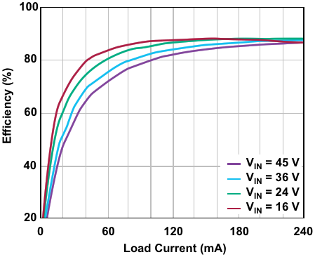 Figure 6. The power loss curve shows the efficiency of a nonsynchronous, dual-inductor inverting output DC/DC converter
