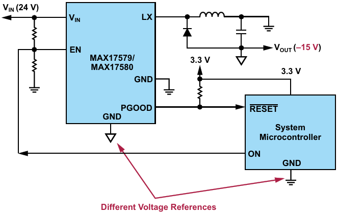 The MAX17579/MAX17580 in a system using negative voltage rails