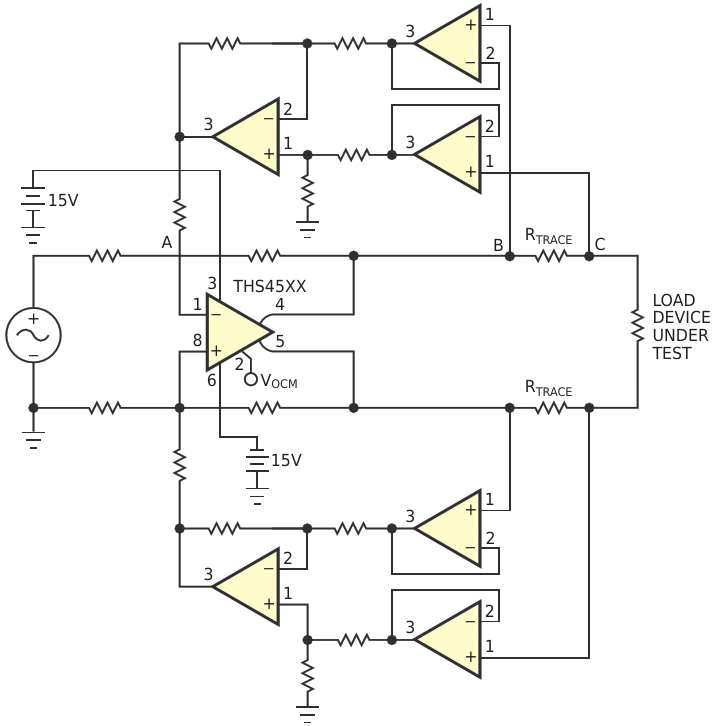 Figure 1. This fully differential circuit compensates for voltage drop and phase shift in transmission lines
