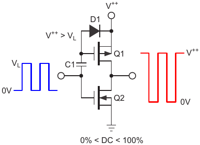 Driving CMOS totem poles with logic signals, AC coupling, and grounded gates
