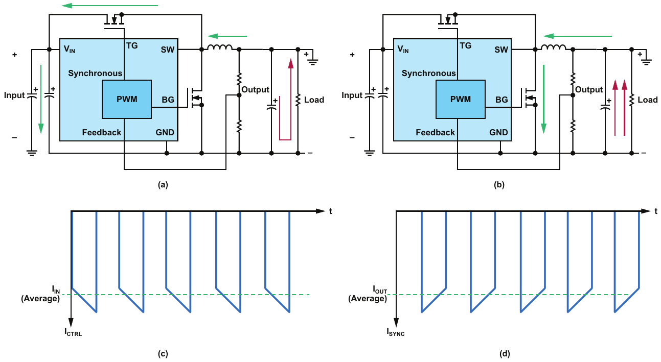 (a) Current flow during on-time, (b) current flow during off-time, (c) current through the top/control MOSFET (ICTR), and (d) current through the bot/sync MOSFET(ISYNC)