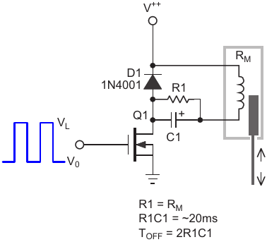 Basic driver circuit where C1 actuates, current-halving R1 sustains, then C1 discharges through R1 during T