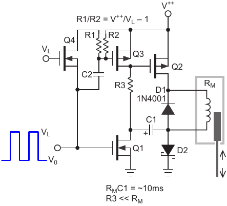 for actuation, Q2 and D2 sustain, then Q3 rapidly discharges C through R to quickly recover for the next cycle