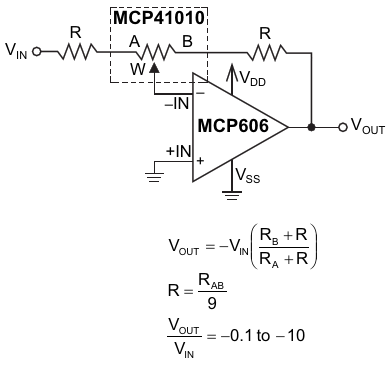 Figure 1. Two fixed resistors are added to bound the gain range to the recommended limits while keeping full 8-bit resolution