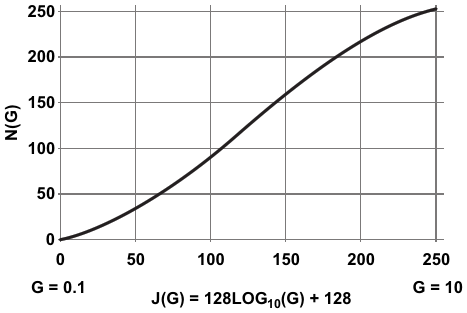 Figure 3. The Dpot settings [N(J)] versus log table indices [J(G)], summarizing the relationship between G, J, and N